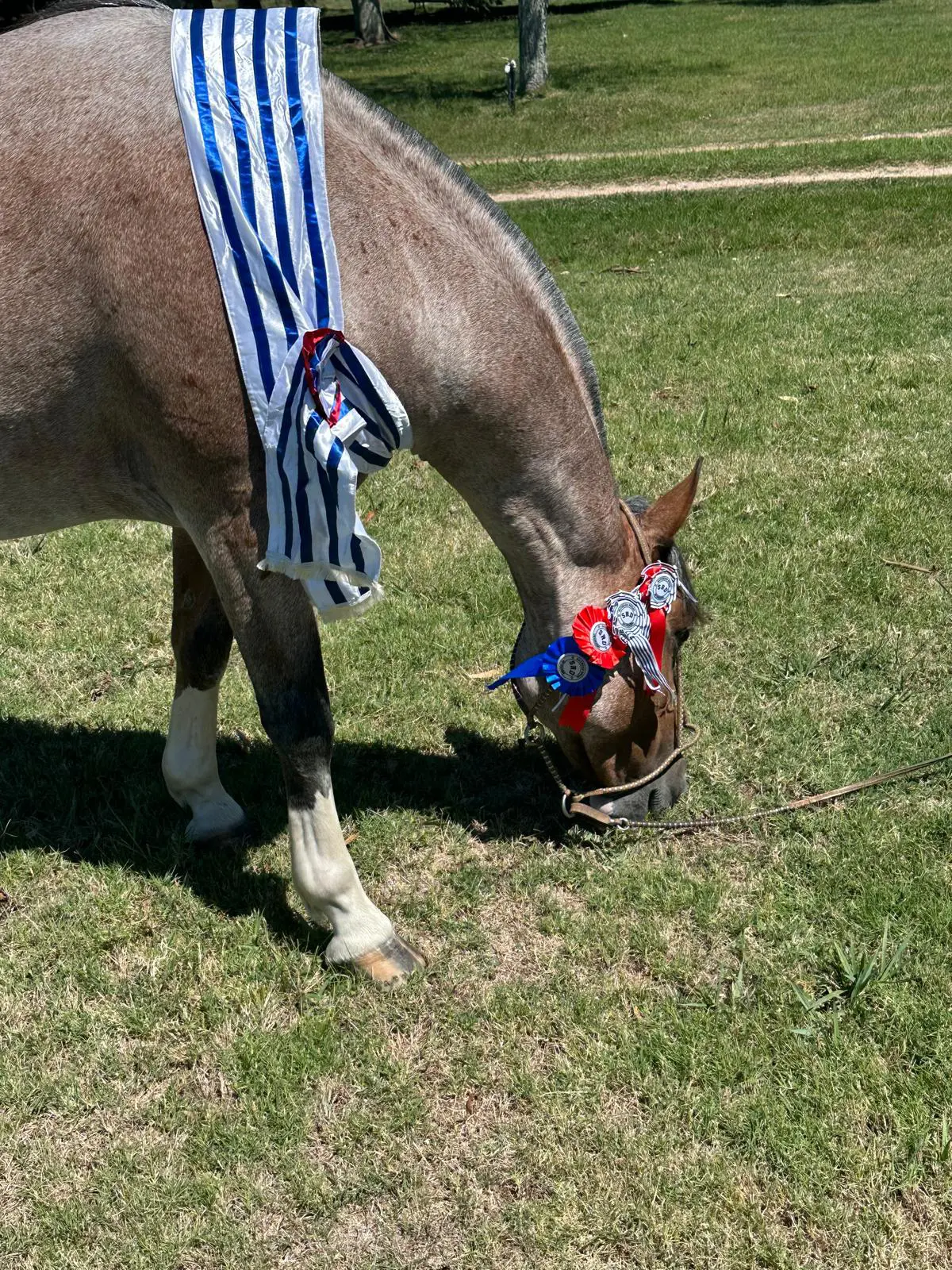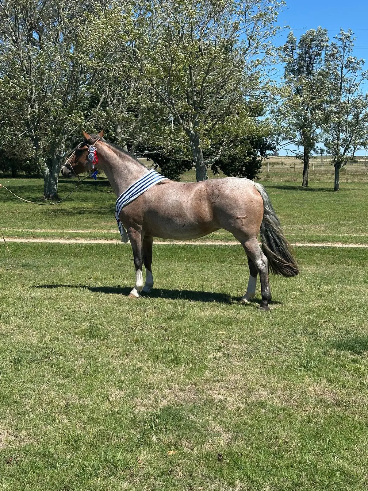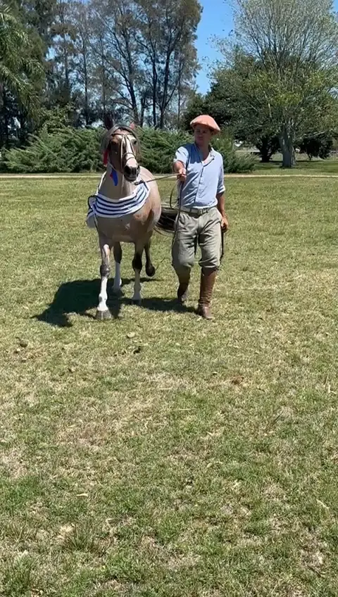 Auch ihr Erscheinungsbild trägt diese Herkunft selbstbewusst nach außen: „Rosillo gateado, Malacara al pico, pata derecha y dos manos“ – ein Falbton – wie man ihn bei traditionellen, südamerikanischen Criollos schätzt – mit charakteristischer Aufhellung, eine bis zur Maulspitze reichende Kopfzeichnung sowie markante weiße Abzeichen an einem Hinterbein und beiden Vorderbeinen – eine ausdrucksstarke Stute mit klarer Identität und hohem Wiedererkennungswert.